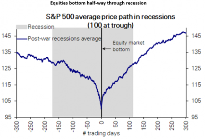 Les actions trouvent généralement leur point bas au cours de la récession. Pas au début, pas à la fin, mais pendant la récession (graphique ci-dessous). Aussi, elles n’atteignent pas leur point bas avant la dernière hausse de taux de la FED. A ce jour, ces deux conditions ne sont pas encore vérifiées alors que les Etats-Unis ne sont pas encore entrés en récession, d’autant que l’inflation reste difficile à juguler. Le point bas est à venir, en toute vraisemblance, dans les prochains mois.