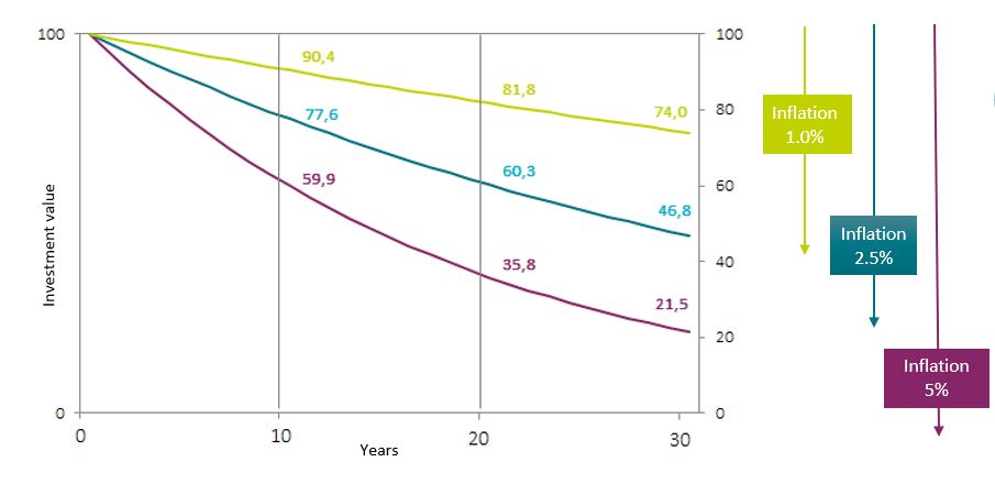 Si l’inflation annualisée sur 10 ans est de 2,5 %, le capital connaît une érosion de 22 % sur la période.